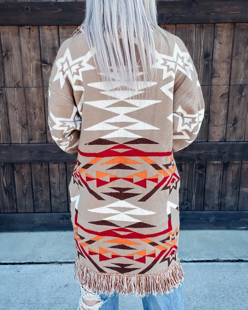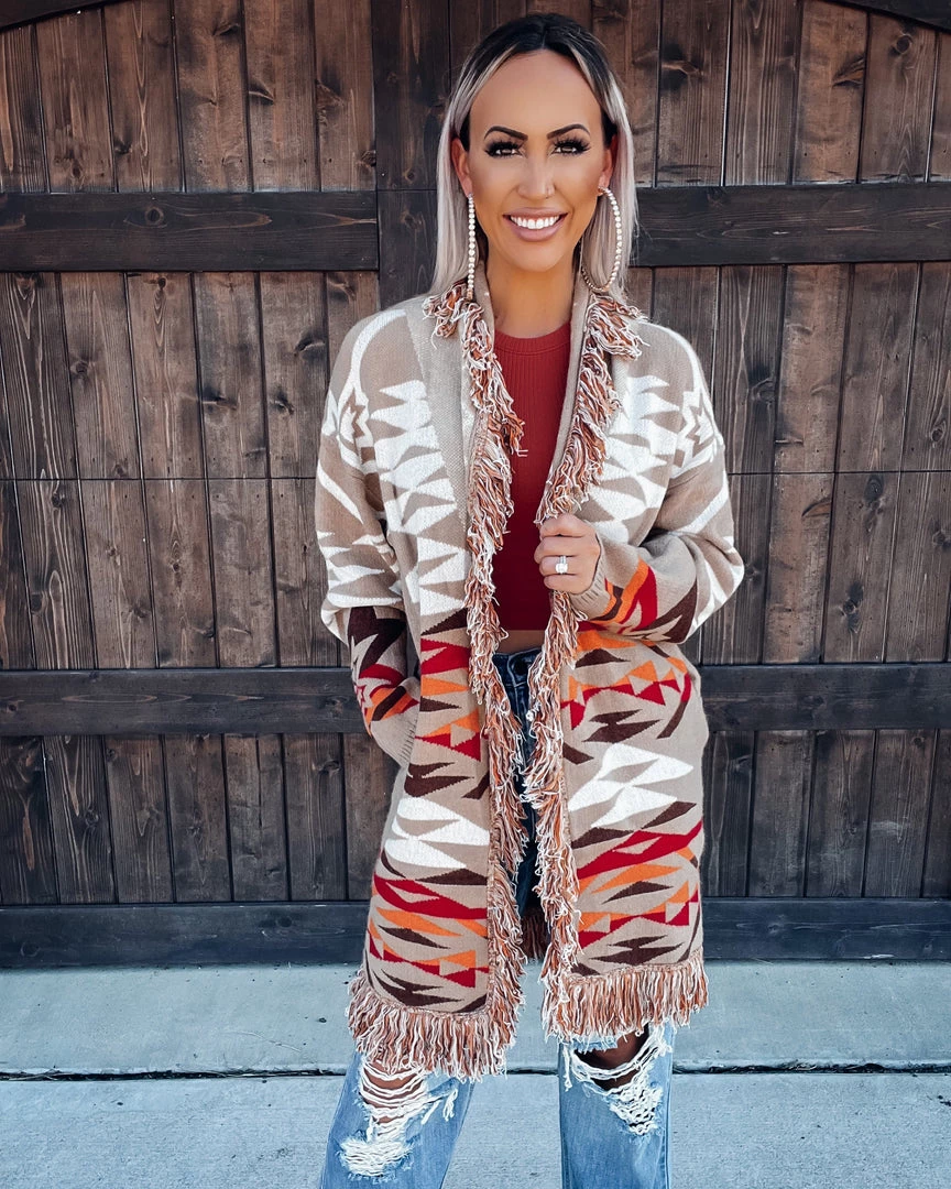 Bar T Boutique Lonesome Dove Aztec Fringed Cardigan – Taupe Outerwear