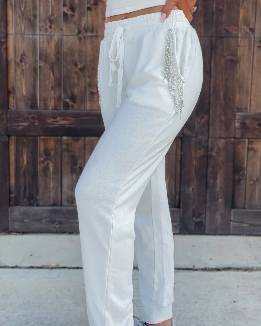 Be the first to review “Bar T Boutique Rhinestone Detail Joggers – White” Cancel reply