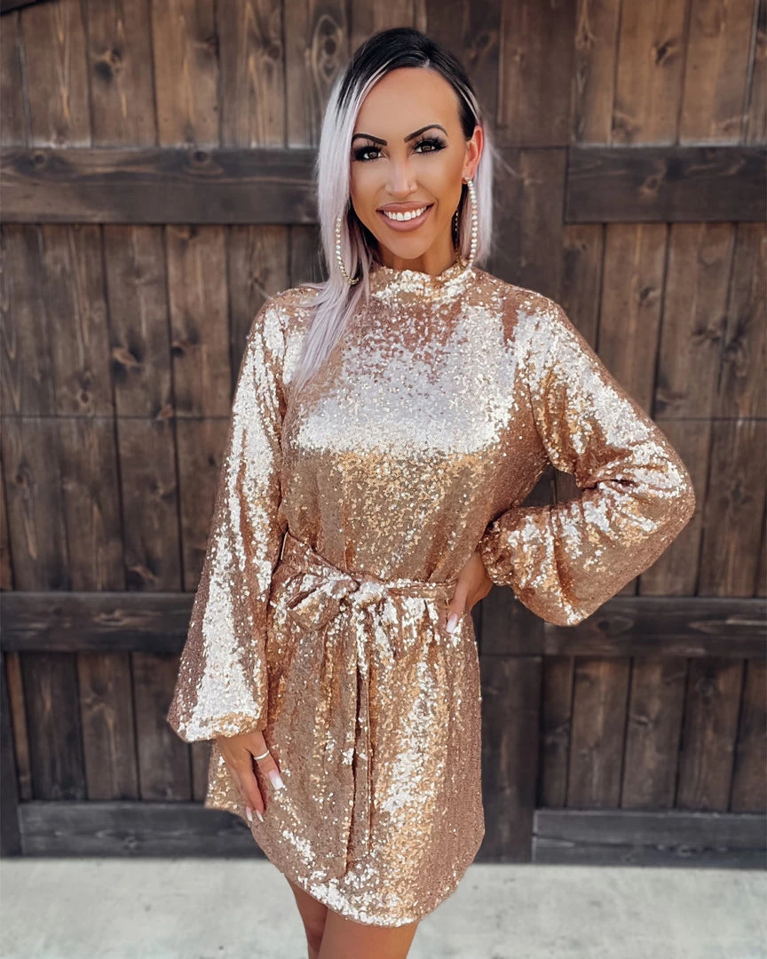 Bar T Boutique Shining Star Mock Neck Sequin Dress – Gold