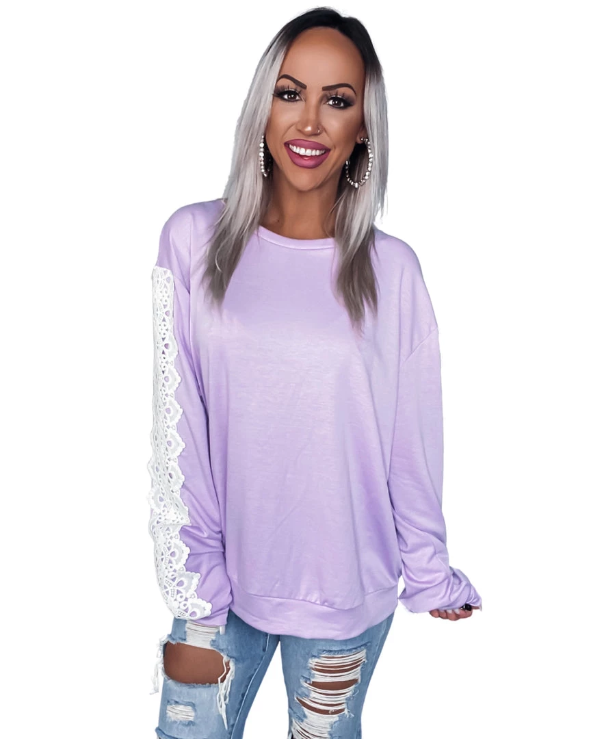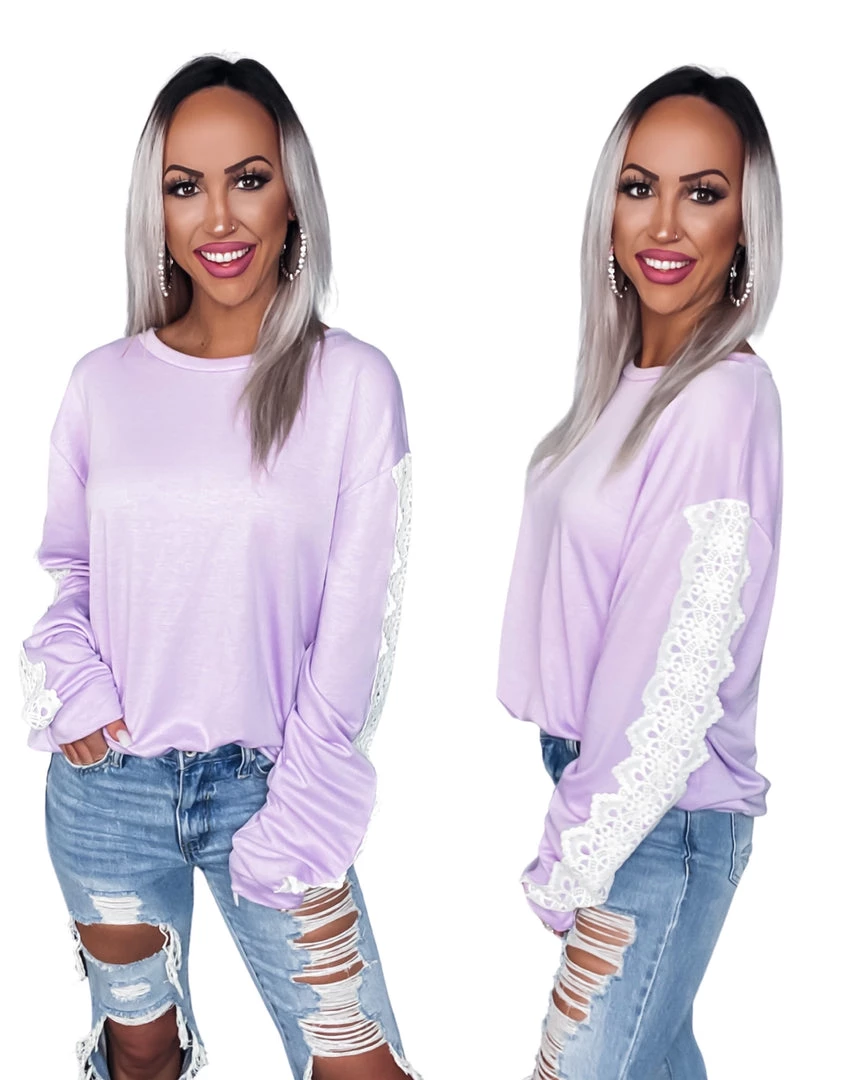 Bar T Boutique Tops Spring Bliss Lace Sweatshirt – Lilac