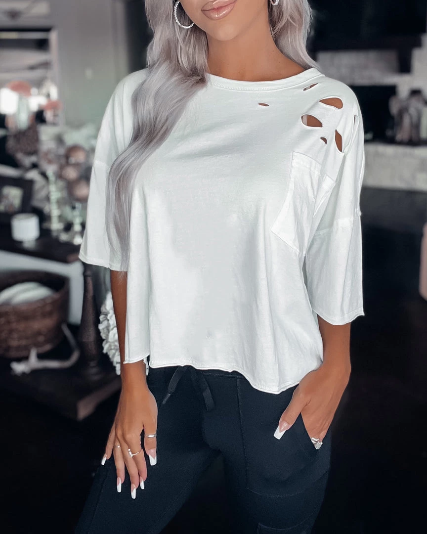 Bar T Boutique Vintage Distressed Oversized Crop Tee – White